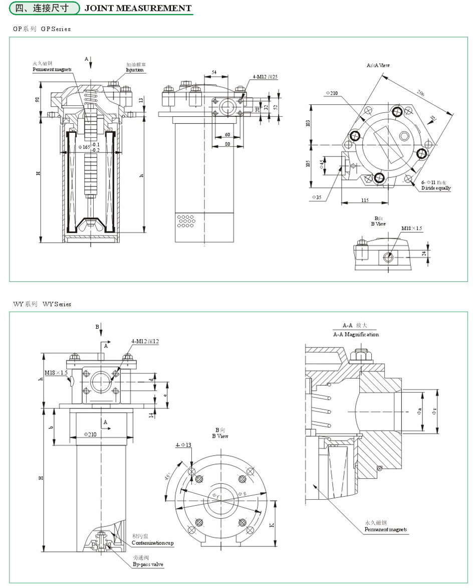 WY磁性過濾器僅一小部分的濾頭連接部分露在油箱外,其余大部分都在油箱內(nèi)部,從而簡化了系統(tǒng)管路,安裝方便,系統(tǒng)排列緊湊美觀。在結(jié)構(gòu)上我們改進(jìn)了原來管路回油過濾器的龐大結(jié)構(gòu),